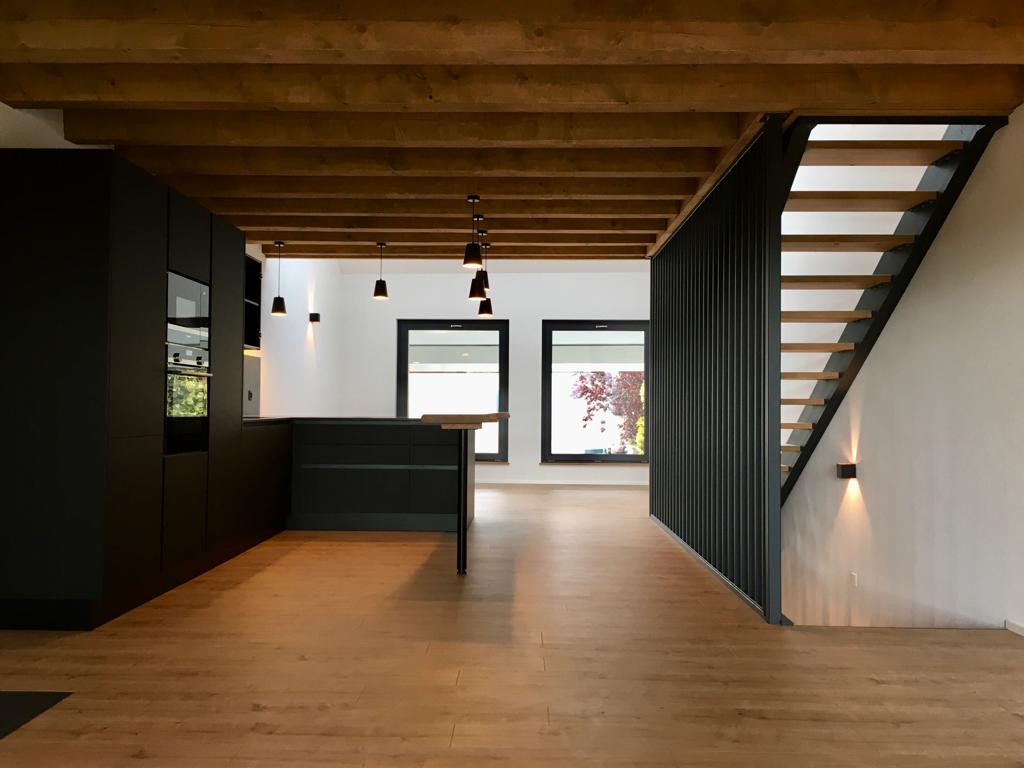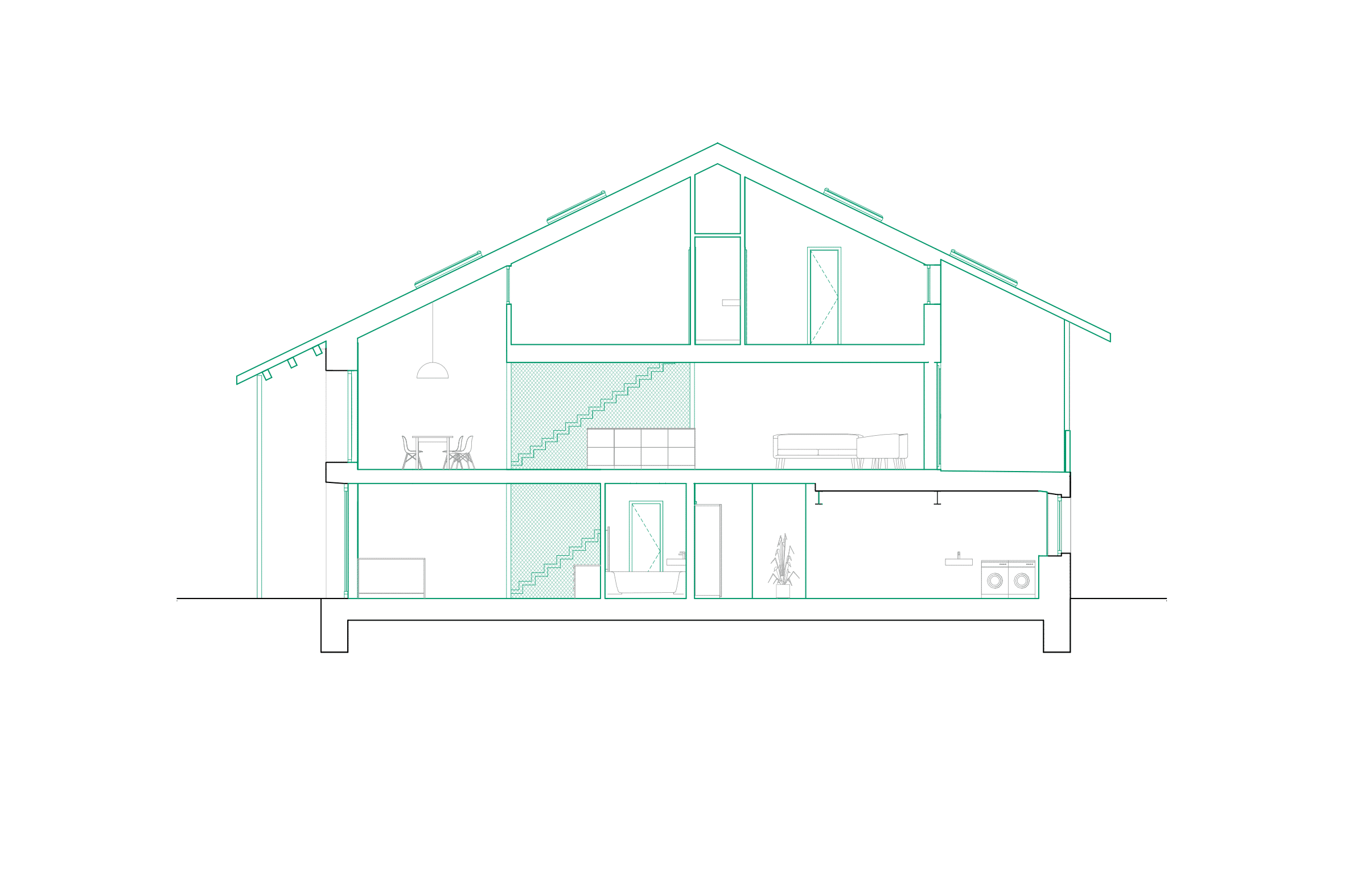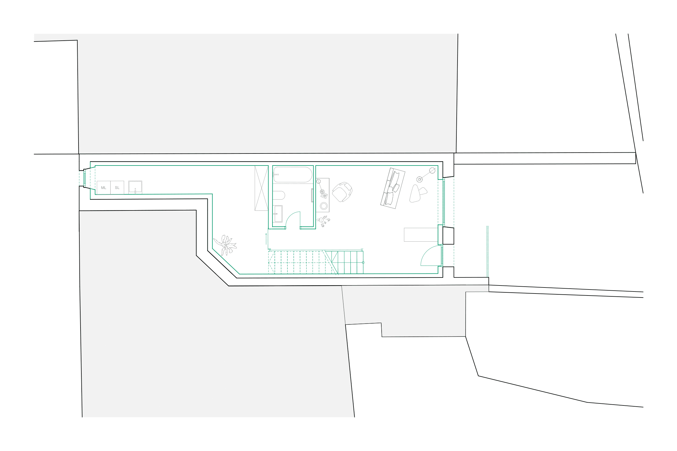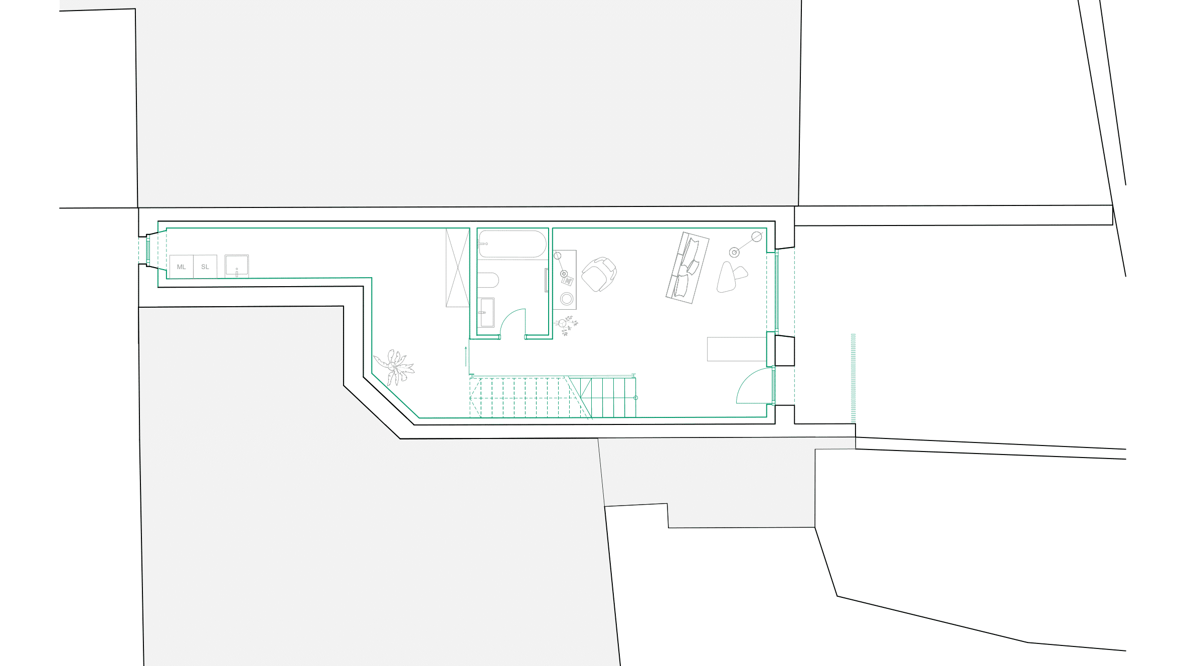 Création d’un logement se développant sur 3 niveaux. Le plan étroit et profond impose de mener une réflexion particulière sur l’apport de la lumière.